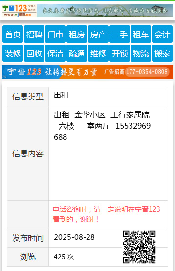 出租 金华小区 工行家属院 六楼 三室两厅 15532969688