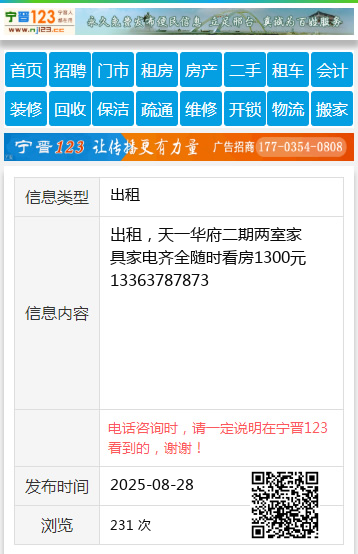 出租,天一华府二期两室家具家电齐全随时看房1300元13363787873