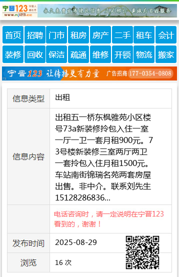 出租五一桥东枫雅苑小区楼号73a新装修拎包入住一室一厅一卫一套月租900元。73号楼新装修三室两厅两卫一套拎包入住月租1500元。车站南街锦瑞名苑两套房屋出售。非中介。联系刘先生15128286836