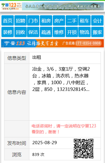 冶金,3/6,3室1厅,空调2台,冰箱,洗衣机,热水器,家具,1000,八中附近,2层,850,13231928145