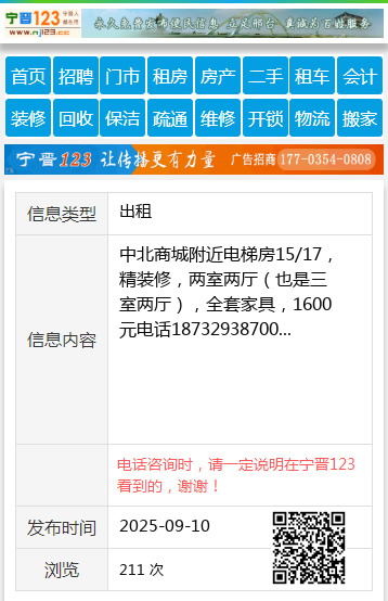 中北商城附近电梯房15/17,精装修,两室两厅(也是三室两厅),全套家具,1600元电话18732938700