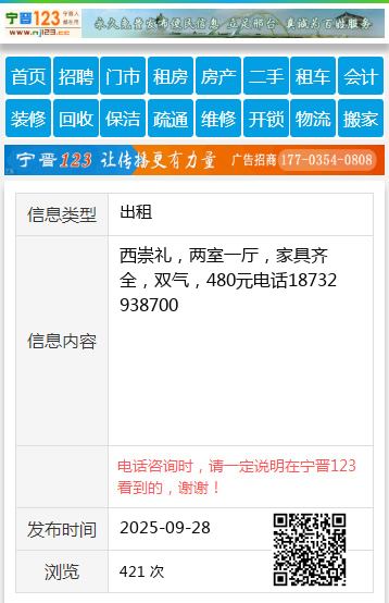 西崇礼,两室一厅,家具齐全,双气,480元电话18732938700