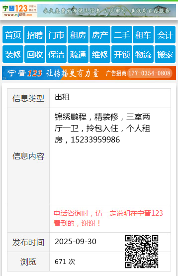 锦绣鹏程,精装修,三室两厅一卫,拎包入住,个人租房,15233959986