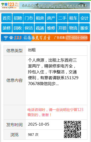 个人房源,出租上东首府三室两厅,精装修家电齐全,拎包入住,干净整洁,交通便利,有意者请联系15132970678微信同步