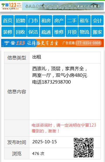 西崇礼,顶层,家具齐全,两室一厅,双气小房480元电话18732938700