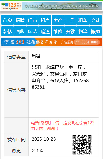 出租:永辉巴黎一室一厅,采光好,交通便利,家具家电齐全,拎包入住。15226885381