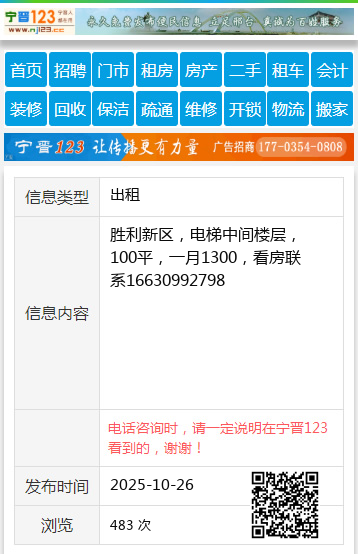 胜利新区,电梯中间楼层,100平,一月1300,看房联系16630992798