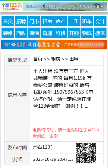 个人出租 没有第三方 恒大城精装一室的 每月1.15k 有需要公寓 装修好点的 请与我联系吧 15075967553 【电话咨询时,请一定说明在邢台123看到的,谢谢!】 |