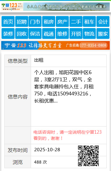 个人出租,旭阳花园中区6层,3室2厅1卫,双气,全套家具电器拎包入住,月租750,电话15094493216,长租优惠