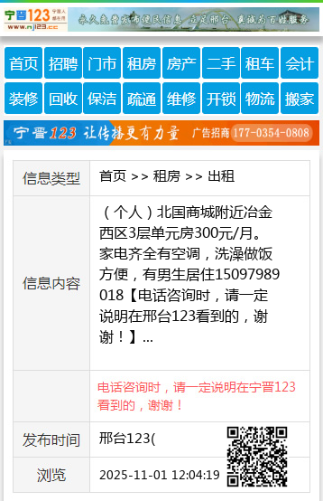 (个人)北国商城附近冶金西区3层单元房300元/月。家电齐全有空调,洗澡做饭方便,有男生居住15097989018 【电话咨询时,请一定说明在邢台123看到的,谢谢!】 |