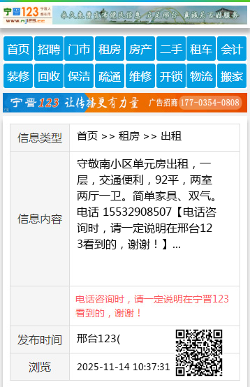 守敬南小区单元房出租,一层,交通便利,92平,两室两厅一卫。简单家具、双气。电话 15532908507 【电话咨询时,请一定说明在邢台123看到的,谢谢!】 |